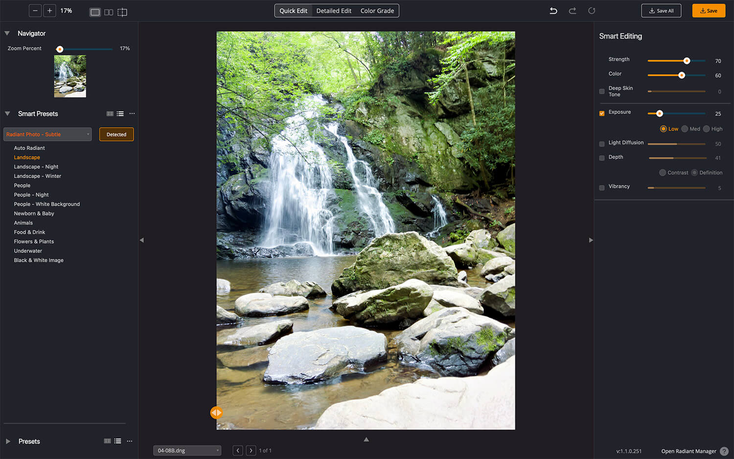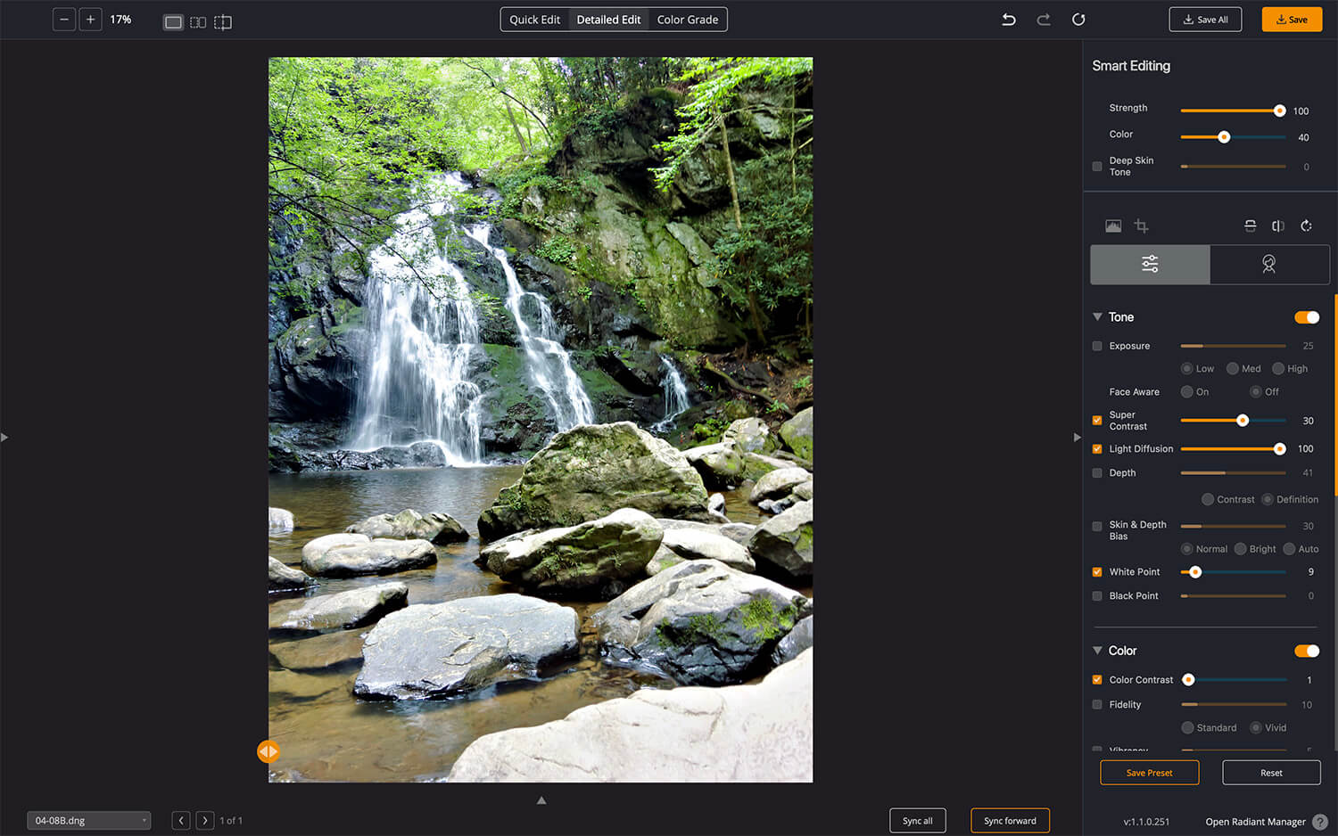 Opening the image, Radiant Photo applies a Smart Preset based on the scene. In this case, the adjustments worked well but need a bit of tweaking.