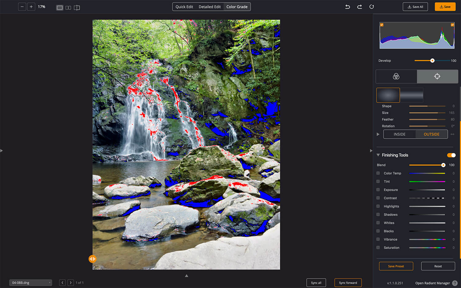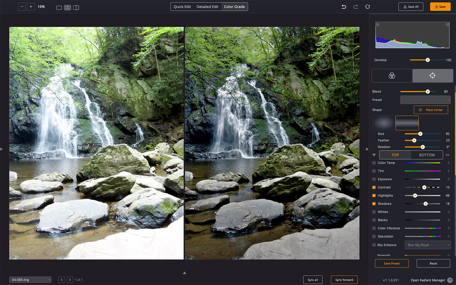 For the waterfall, small adjustments help bring out the contrast in the water.
