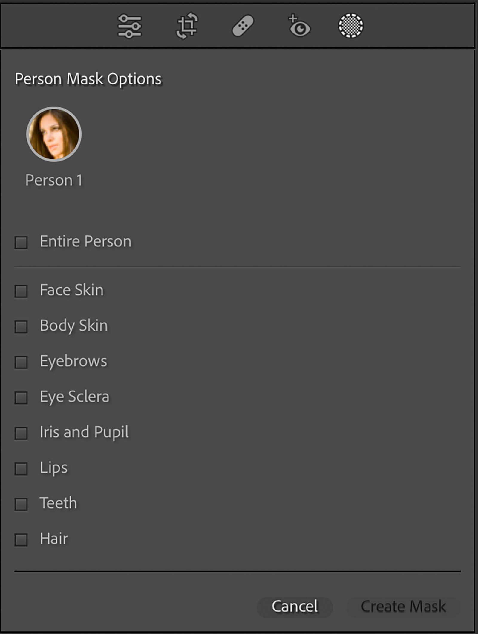 A click on the Mask icon puts the tool to work. First, it sees that there’s a person in the image. A circle with Tiffany’s face appears with the label Person 1. A click on that opens all of the mask options. Uncheck Entire Person now let’s see the available masks.
