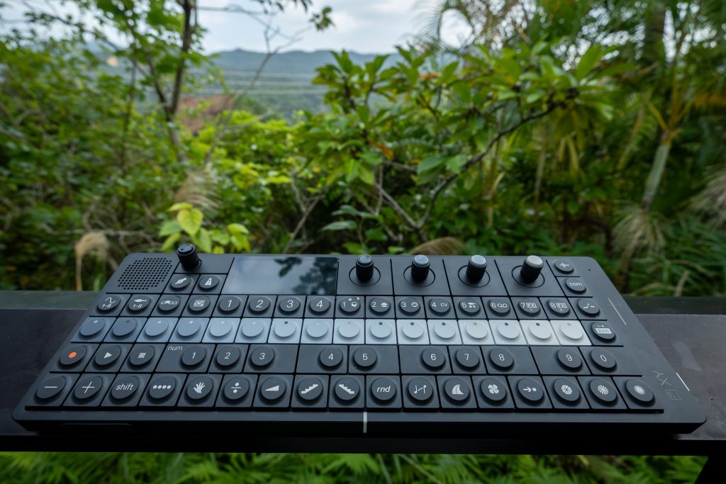 The hardware design backs up that “carry it, use it, trust it” mission. OP–XY is all black, with the exact dimensions of the OP–1 field, and a distinct grayscale gradient at the center that helps the layout read at a glance. The 480 × 222 pixel IPS TFT display uses grayscale graphics, then hits you with bright red for recording and parameter locks, which is the right kind of visual urgency. Vital keys have LEDs, and the 68 ultra low-profile mechanical buttons feel crisp and consistent under your fingers during longer programming passes. A two-octave keyboard keeps melodic work practical without pretending it’s a piano. The pressure-sensitive pitch bend control on the bottom left has a controlled, deliberate response in use, more like a performance surface than a gimmick. On the right side, the advanced I/O layout makes the device feel prepared for real rigs, not just headphones at a coffee shop where I first tested it with a single synth and a pair of travel monitors.