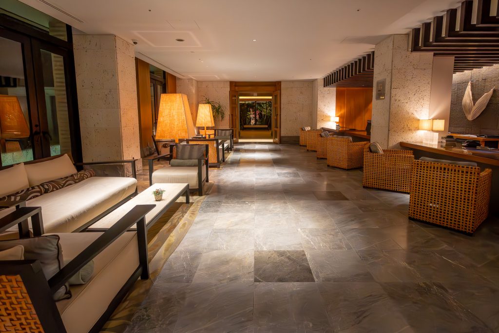 The hotel’s design is described as inspired by the grandeur of Shuri Castle, and you feel that ambition in the way the public spaces stage arrival and movement. This isn’t a beachy lobby that tries to dissolve into the outdoors. It’s more fortress-like in its sense of threshold: a controlled interior that makes you aware you’ve entered a composed environment.