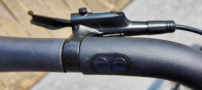 The user experience is built around a 2.5-inch color display flanked by four buttons: two next to the left grip and two next to the right. From left to right, you have the horn next to the on / off / next button, then the minus and plus buttons for scrolling through pedal-assist levels and preferred bicycling cadence (more on that later).